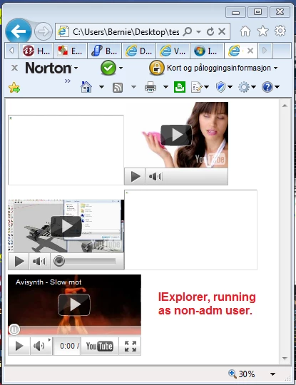 Here is my system and software configuration. Windows7 - IE8 32 bit -- latest Flash version. Flash plays embedded videos under administrator account but not on the other user accounts. Youtube and tests on adobe site shows flash working on all accounts. I've checked IE security settings and kill bit in the registry. Harware acceleration does not make a difference. I've unloaded and loaded Flash multiple times even in the other accounts changing account type to administrator temporarily. Nothing will make it work. I've checked firewall and Norton AV turning them on and off. I am out of ideas and out of patience. Does anyone have any suggestions?