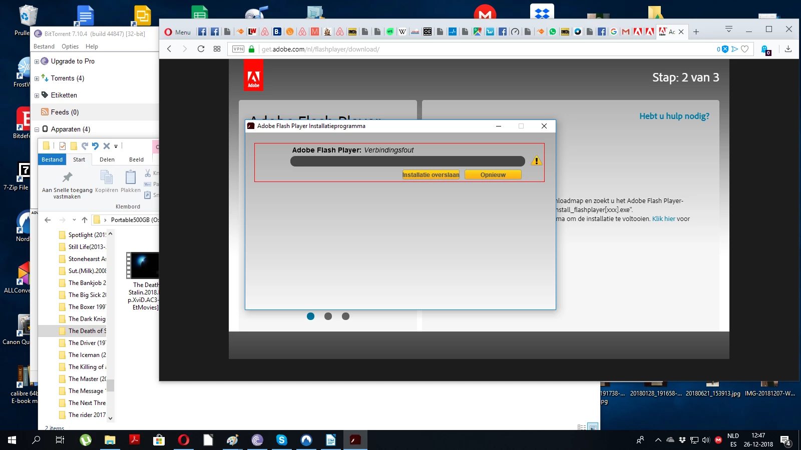 I have tried several timens to update Flashplayer. I receive the .exe file but whwn I open it I receive tjhe message "connection error"