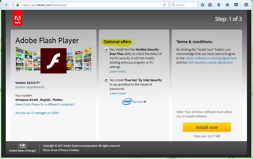 Adobe, flash is about dead. WHY are you forcing installation of bloatware virus scanner? I installed Flash before, but never again. Every time I need to update, I need to force uninstall McAfee which runs multiple processes and bogs everything down? No thanks. Hope it's worth your few pennies to see Flash die completely.