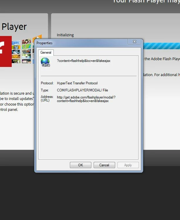 As you can see, this does not go to anything Adobe. If I right click on the "click here" link and view properties, it shows me the following.