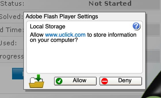 I cannot get Mac and Flash to play nicely on UClick.com site. When opening a crossword from UClick, I get a pop up that wants me to allow Flash to use local storage. I cannot click on the pop up. I can do a right click, Global Settings, Allow for the site, but this doesn't change anything in the browser. This has been happening since 3 updates ago.
