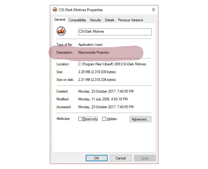 hi all I just recently installed an old game I have had for a long time and because it is classed as a macromedia projector file it doesn't work does anyone here know a work around for this problem at all? the game is called CSI: dark motives