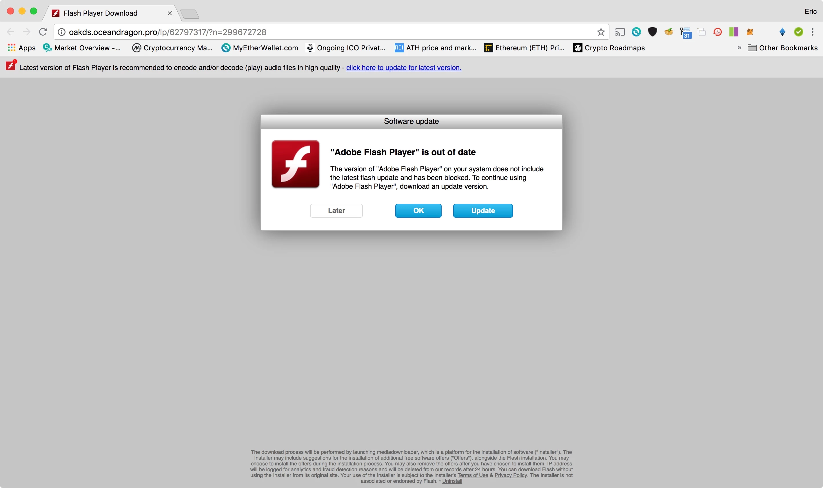 My Macbook has never had a virus or malware issue for many many years, until now. Somehow I must have got some malware that is constantly telling me to update my Flash Player. This is malware, I have downloaded and purchased several Anti-Malware/Anti-Virus products recommended by Apple. Non of these has helped the situation so I'm turning to Adobe and this community for answers. Below are screen grabs of the malware in action. Please can someone help me as I can't imagine having to wipe this computer and start from scratch for one piece of malware!
