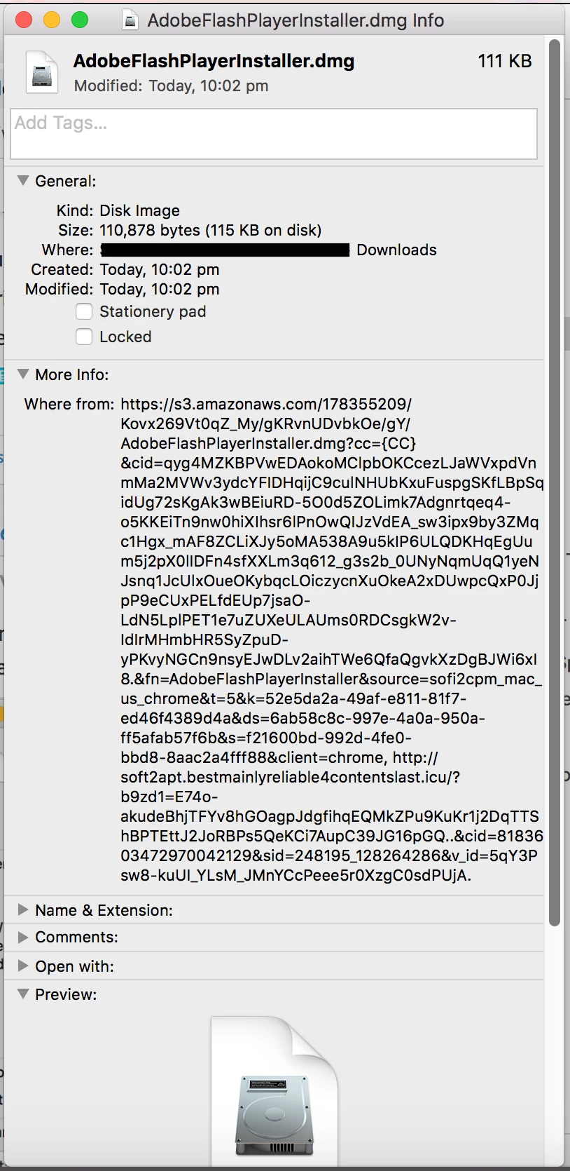 Last week I foolishly installed malware disguised as flash player on my mac. Today I had a pop up telling I should update the Flash Player; it was not from an adobe url so I suspect. But this time I captured the url instead of clicking on it.