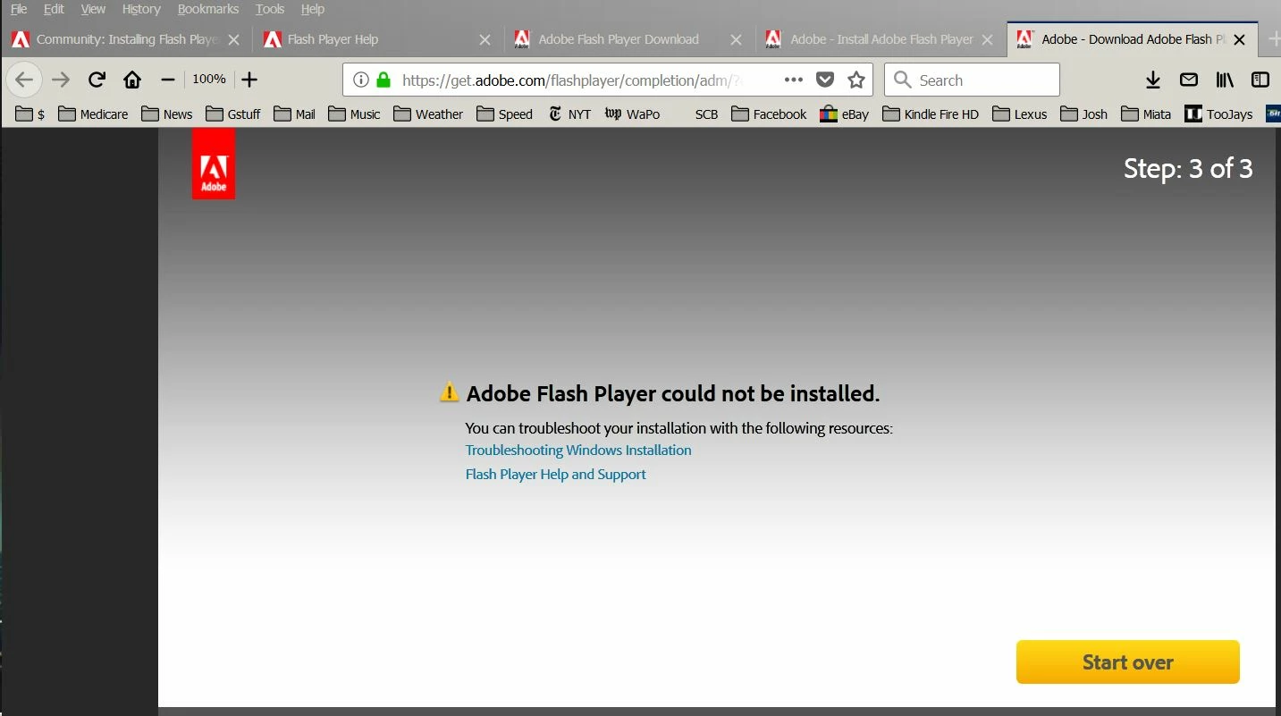 New browser tab opened- "Adobe Flash Player could not be installed." (see scrnshot03.jpg)