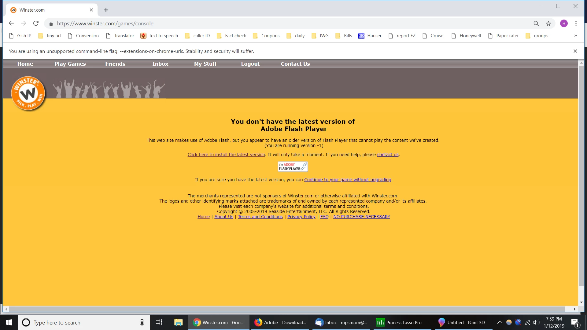 I have the latest version of Microsoft Edge 42.17134.1.0, chrome Version 71.0.3578.98 (Official Build) (64-bit) and firefox 64.0.2, as well as flash Version: 32.0.0.114, and I have "allowed" flash on all browsers, yet I still get this when I try to play a game. Running win 10, 64bit with latest updates. One chrome and edge, I get the screen below, in firefox, it just doesn't load. Now, all of a sudden, winster is working on chrome and edge after not working many other times. Still not working on FF even though it clearly states flash is enabled. WTF? Any suggestions?