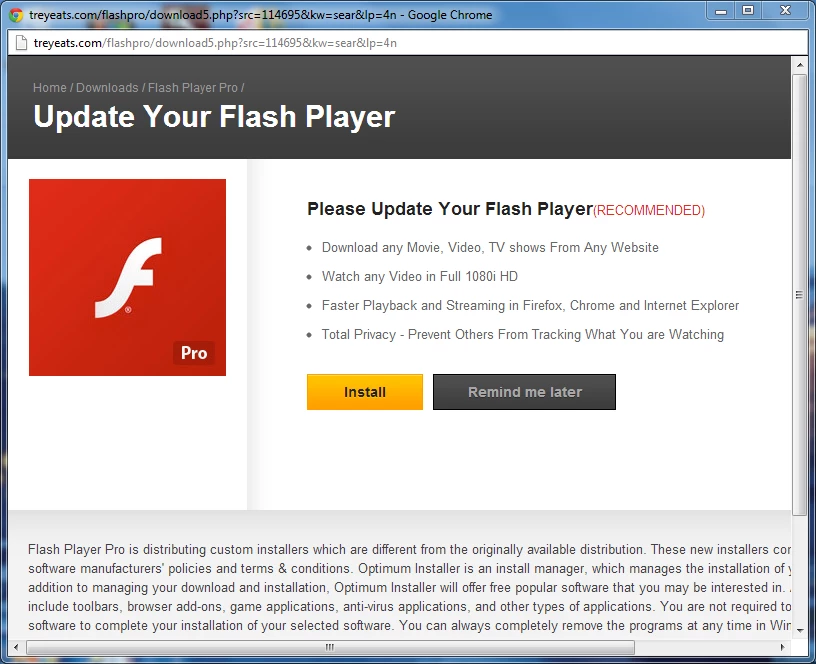 Flash Player Pro is distributing custom installers which are different from the originally available distribution. These new installers comply with the original software manufacturers’ policies and terms & conditions. Optimum Installer is an install manager, which manages the installation of your chosen software. In addition to managing your download and installation, Optimum Installer will offer free popular software that you may be interested in. Additional software may include toolbars, browser add-ons, game applications, anti-virus applications, and other types of applications. You are not required to install any additional software to complete your installation of your selected software. You can always completely remove the programs at any time in Windows’ Add/Remove Programs.