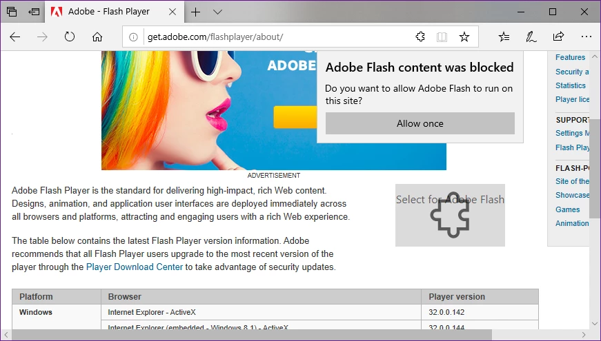 It sounds like a content issue.  What happens when you go to Adobe - Flash Player  on Edge, IE, and Chrome?