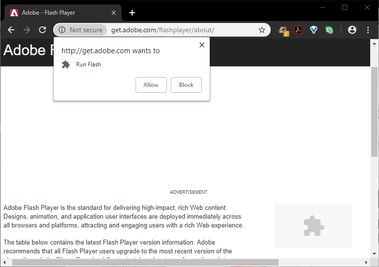 Clicking the puzzle piece, in either the address field, or the content, results in Edge prompting: