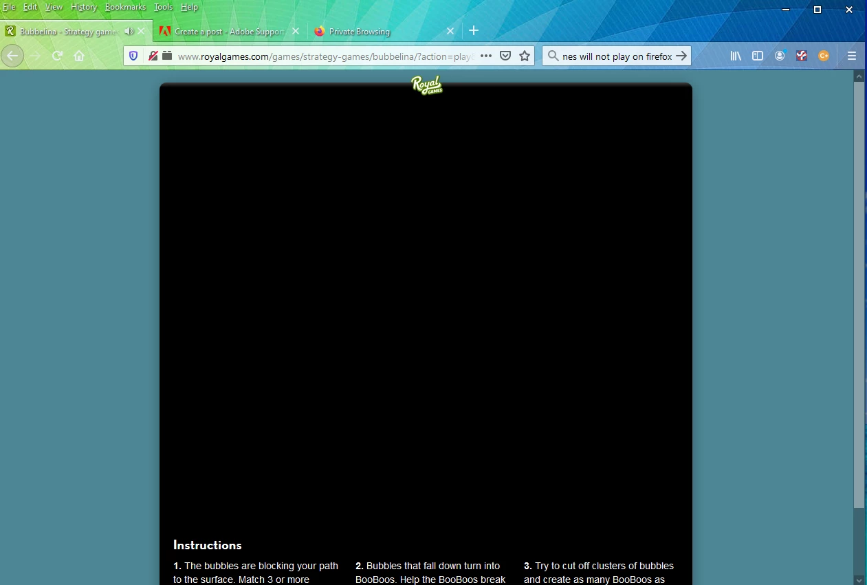 I mainly use Firefox but no matter what browser I use the game keep asking me to update my flash player. I have tried Chrome and Brave and they give me the same message to update my flash player. I have uninstalled and reinstalled flash player, but it still asks to update. If I tell it to skip, which is another option, I get a black screen when the game comes up. The game is playing because it has the sounds, but just a black screen. This has been happening for a couple weeks and is very frustrating. Thank you for your time.