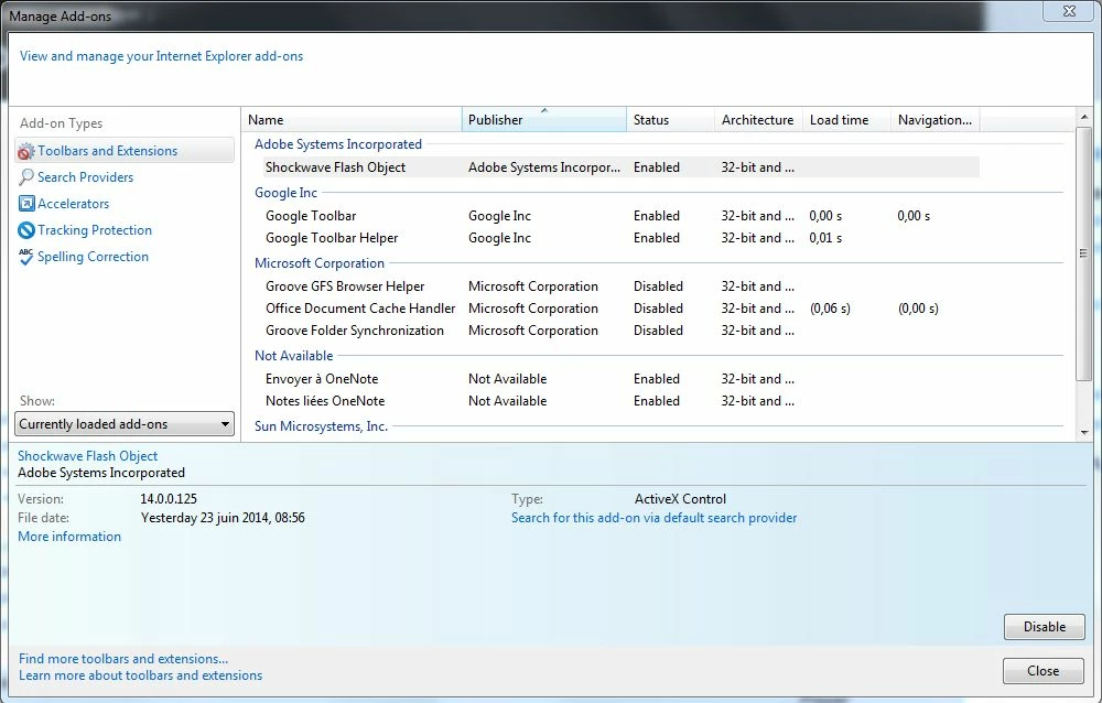 I installed Flash Player 14.0.0.125 for Windows for IE with the install_flash_player_14_active_x.msi downloaded.