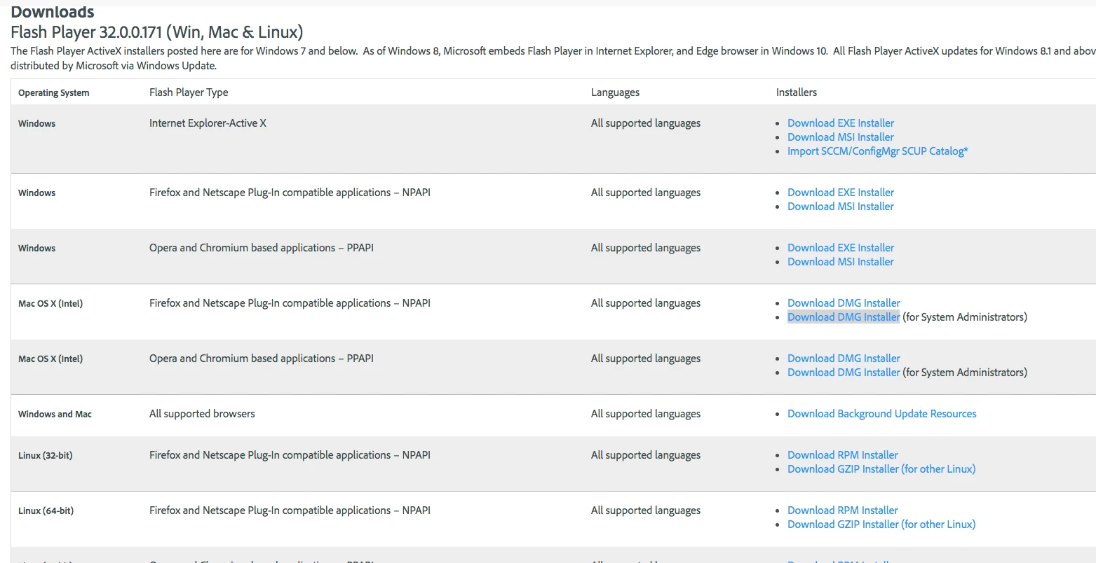 Within that page are various versions of Flash player for download on different Operating Systems and also special System Administrator installers that are designed to make mass deployment easier.