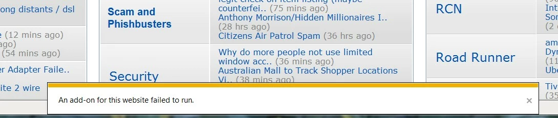 I am puzzled by this; I have used dslreports.com in the past, but never had such a message.  I wonder what add-on should be running on that site?  Is there anything in the event logs that could give you some information what add-on has failed to run?