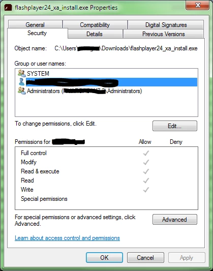 Thank you very much for posting the screenshots. If you've installed Flash Player using this file, it should have been deleted (the online/shim installer, which this is, deletes itself after it has been executed) the fact that it's still there indicates an issue with the permissions on your file system.  You can find out what permissions you have on the file by doing the following: