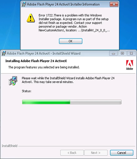 Product: Adobe Flash Player 24 ActiveX -- Error 1722.There is a problem with this Windows Installer package. A program run as part of the setup did not finish as expected. Contact your support personnel or package vendor. Action NewCustomAction1, location: C:\Users\USER\AppData\Local\Temp\{BBFE8F5D-C440-45C7-B9C5-B6445D2C9B56}\InstallAX_24_0_0_221.exe, command: -install -msi -prev 0