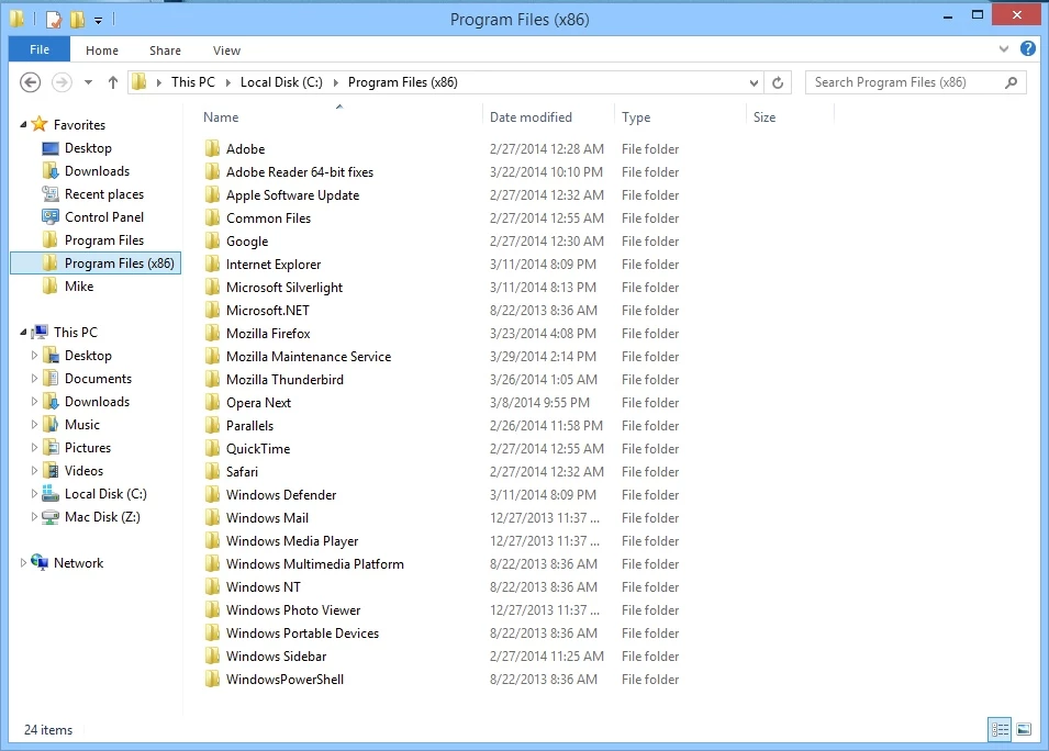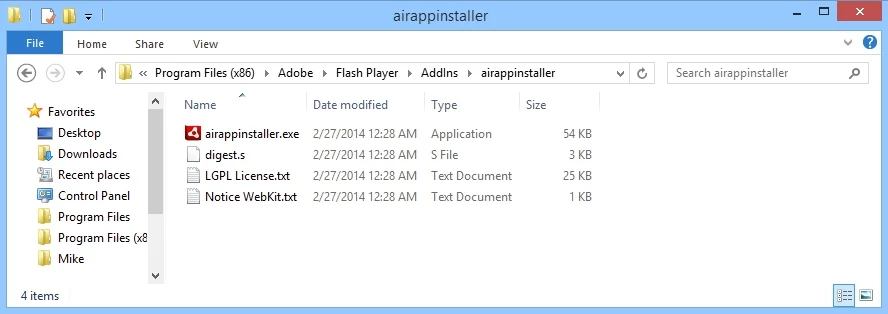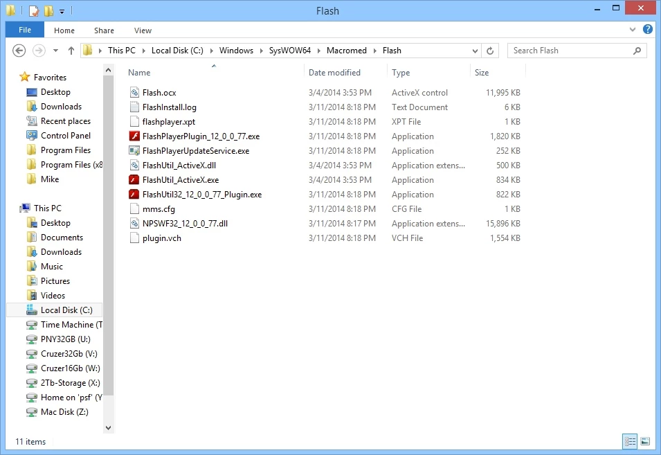 What files are in the Program Files (X86) folder for Flash Player for Windows 8.1?