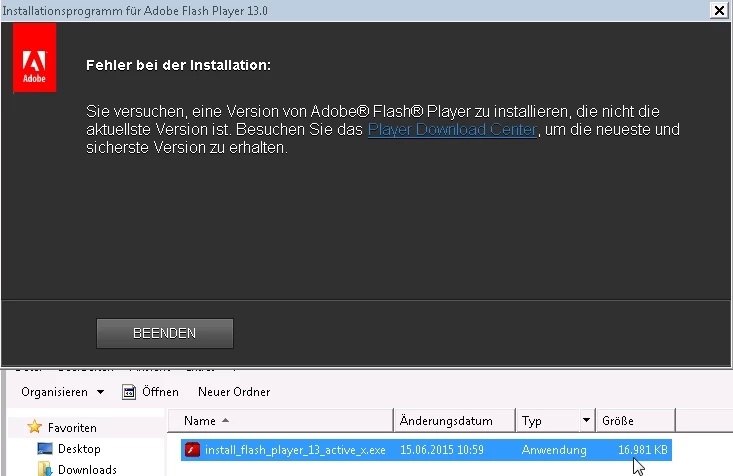 „Fehler bei der Installation: Sie versuchen, eine Version von Adobe Flash Player zu installieren, die nicht die aktuellste Version ist. Besuchen Sie das Player Download Center, um die neueste und sicherste Version zu erhalten.“