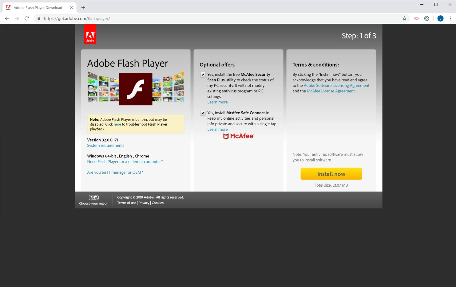 (I updated Adobe Flash Player, and there were NO 'opt out' options. I managed to force quit the installer after it had updated Flash and before the McAfee install completed. Who knows what junk it's left on my machine).