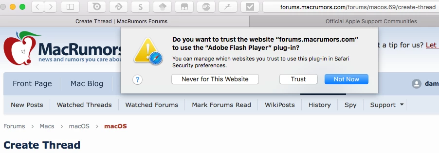 Lately, I've been receiving the prompt, "Do you want to trust the website '[URL of website]' to use the 'Adobe Flash Player' plug-in" prompt from Safari for sites that don't appear to require it (e.g., MacRumors, PayPal).
