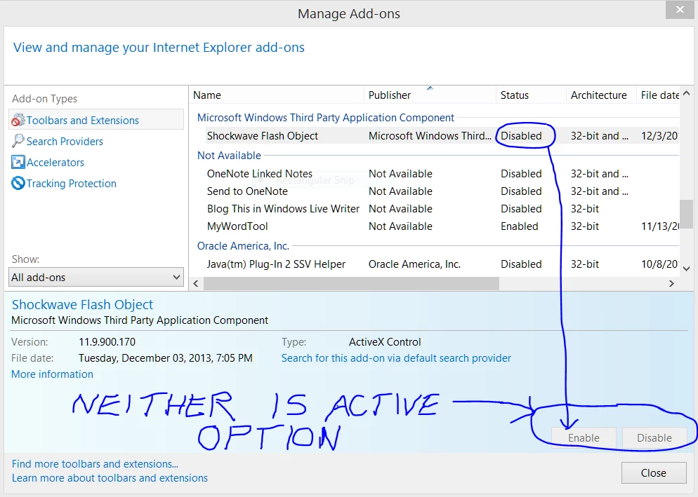 Why is the enable/disable box inactive in Manage Add Ons for Flash Object