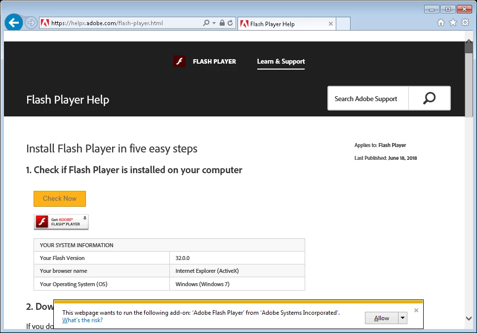When going to this page https://helpx.adobe.com/flash-player.html and clicking Check Now it says that Flash is installed, but for version it only says "32.0.0" and the animation further down on the page does not load.