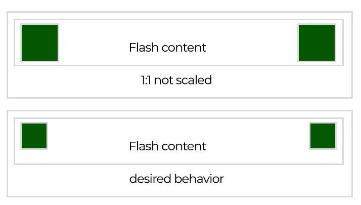 I am trying to replicate Flash content zooming/scaling behavior in my app as seen in Internet Explorer. Googled all day to no avail. Flash content contains some "constantly displayed" elements (think of it as game's HUD). IE, when we set its zoom to, say, 75% scales down these elements, like using ActiveX control directly on HiDPI display. Player's frame size stays unchanged. Movie is embedded with "scale=noscale", which should produce desired behavior as per doc. Calling Zoom on hosted ActiveX indeed scales down the content but HUD is scaled as well and does not retain its position, which is not desired. I also tried to host Flash Player inside MS WebBrowser control (IE engine) and calling ExecWB with OLECMDID_OPTICAL_ZOOM with no success. Everything else on the page zooms correctly, but Flash renders its contents 1:1. To be more funny, I ran the same movie, using the same HTML in IE and it gave desired behavior. So either I am doing something wrong or WebBrowser control does not pass something to Flash or Flash itself misses something.