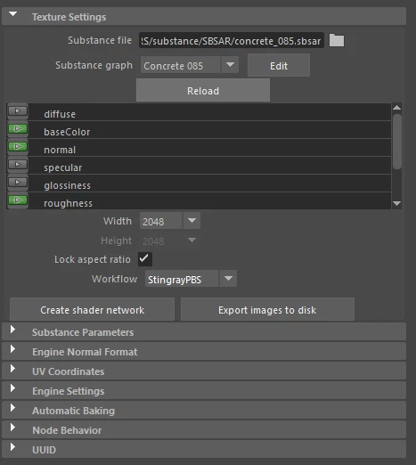 I've attached a picture of my sbsar node settings in the Maya hypershade.
