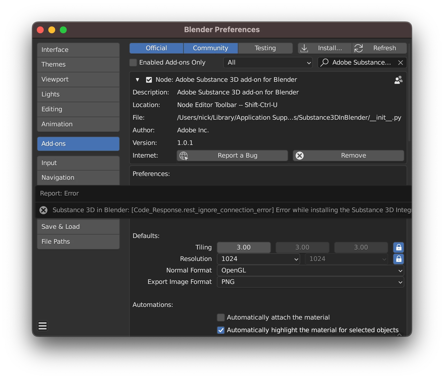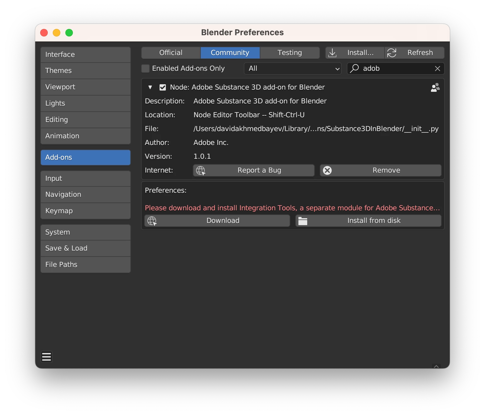 I have been using the blender add-on integration tools to load the adobe Substance materials in my 3D files. But now I have a new laptop (macbook pro) and when I try to install the same add-on and integration tools it does not work anymore. I get an error trying to install the add-on and all the materials I try to apply are shown as black.