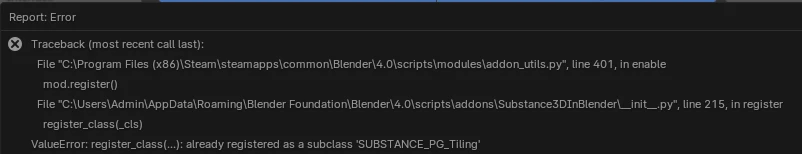 Hi, I'm trying to install the substance blender plugin, but I don't even have the option to enable it to install the integration tools. This is the error I'm getting. I don't really understand what I'm looking at, do I need to reinstall blender or something?
