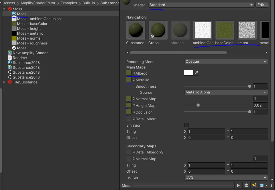 On Unity, a Substance default material will automatically assign its outputs using the Standard Unity shader. (Albedo, Normal, etc, all the standard outputs). Is it possible to use a custom shader here and replicate that behaviour? What are the shader properties Substance internally looks for?
