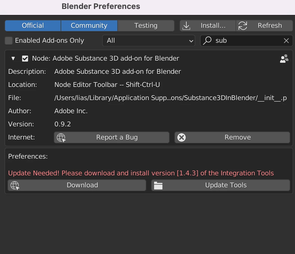 I have the following problem: I installed the Substance 3d Blender addon on my Mac and then tried to continue installing the integration tool, but I always get an error saying that i have to install version 1.4.3 as an update, which is exactly the version I downloaded and tried to install before.