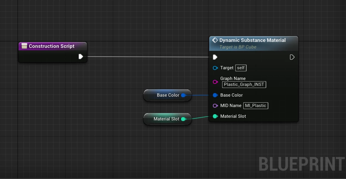I'm working on a project where I create dynamic materials from a Substance Factory and make the exposed parameters accessible via Blueprint variables. For this I have built a function that I can use either in the construction script or the event graph to set the materials.