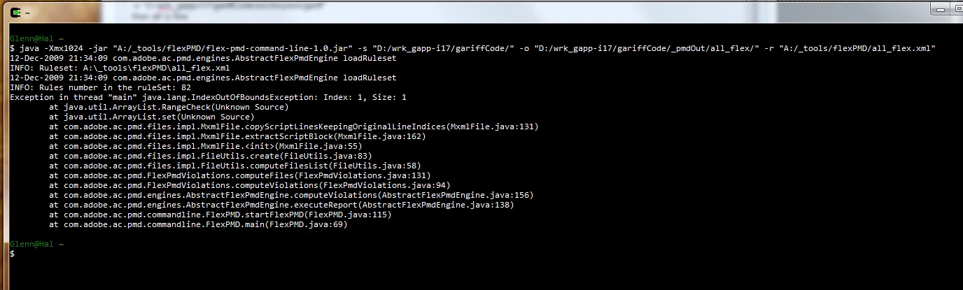 $ java -Xmx1024 -jar "A:/_tools/flexPMD/flex-pmd-command-line-1.0.jar" -s "D:/wrk_gapp-i17/gariffCode/" -o "D:/wrk_gapp-i17/gariffCode/_pmdOut/all_flex/" -r "A:/_tools/flexPMD/all_flex.xml"