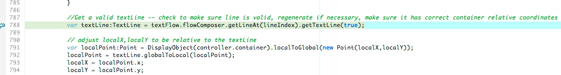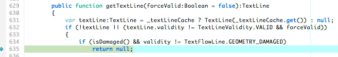Here are some of the variables, leading to the crash. The SelectionManager, TextFlowLine and TextLine are shown