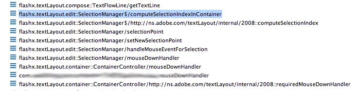 The stack that creates the problem is like this, basically starts with user trying to click into the TextFlow, and TLF trying to figure out what anchorPosition was selected