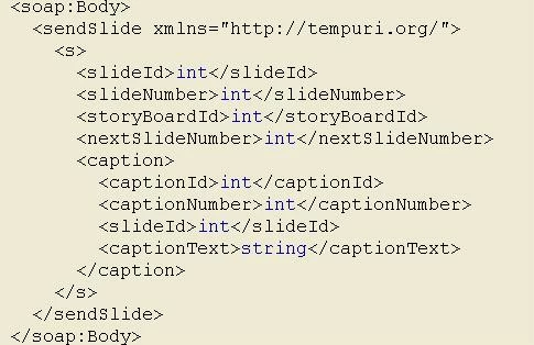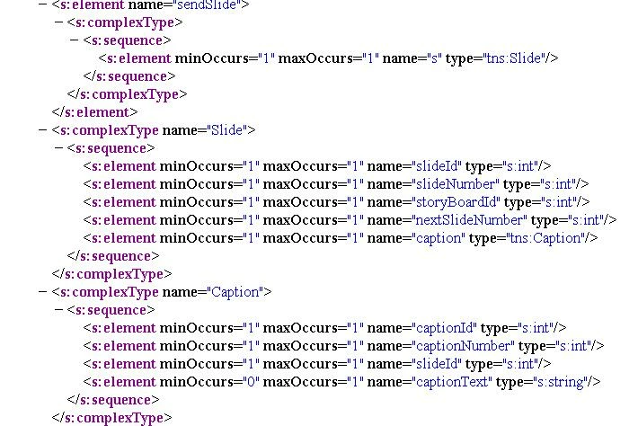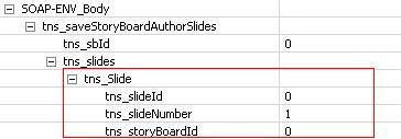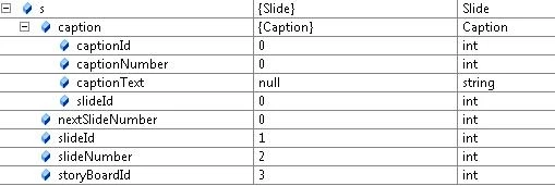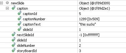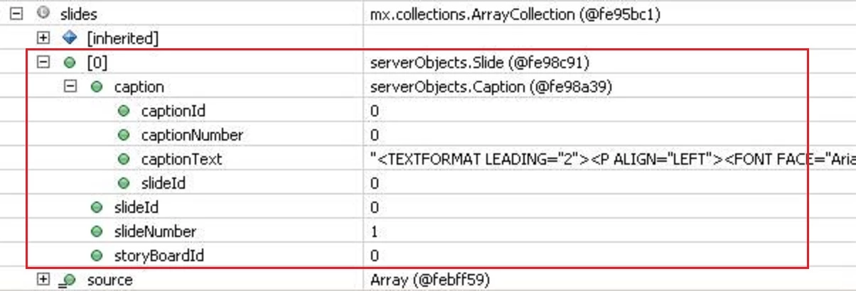 | The object in red rectangle above is of type "Slide" which has an object "caption" of type Caption and other simple properties like slideId (int), slideNumber(int) and storyBoardId(int). | The object in the red rectangle is the xml data of "Slide" corresponding to the object in the red rectangle in the image to the left. Notice that the entire object "caption" has been dropped while the simple properties have been represented. |