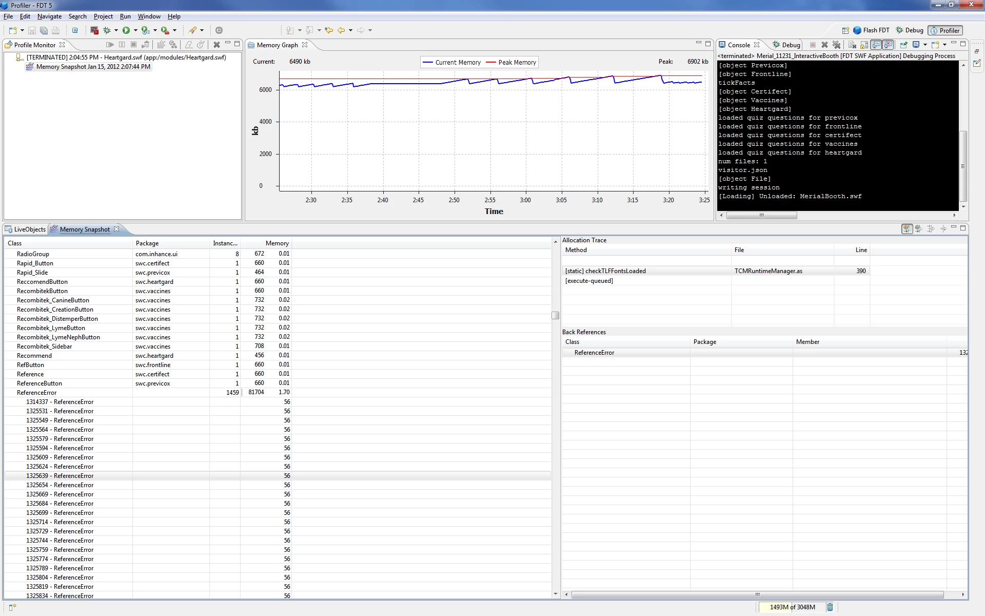 The way the project is built is Flash CS 5.5 is used to import psd files, I set up some linkage classes, then export as a swc. The psd text fields are imported as TLFTextFields. The swc assets are then used in a FDT project compiled with Flex SDK 4.5.1 with AIR SDK 3.1. There are 5 products, each with its own swf. The swfs are compiled as Flash browser swfs and they are debugged/profiled using the standalone Flash player. When I profile the individual swfs there are no reference errors. If I profile the main swf (using adl) without loading the individual swfs, there are no reference errors. It's only when one or more of the product swfs are loaded into the main swf that reference errors start piling up. I've tried conerting the static text fields into bitmaps and registering the fonts (all from the same swc) in each swf and it hasn't made the problem go away but the memory spikes are no longer so dramatic. Any ideas on what is the root cause of this error?