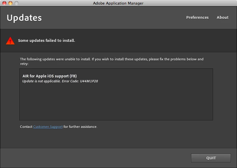 When I try installing the update for the iOS support, I get the message: Update is not applicable. Error Code: U44M1P28