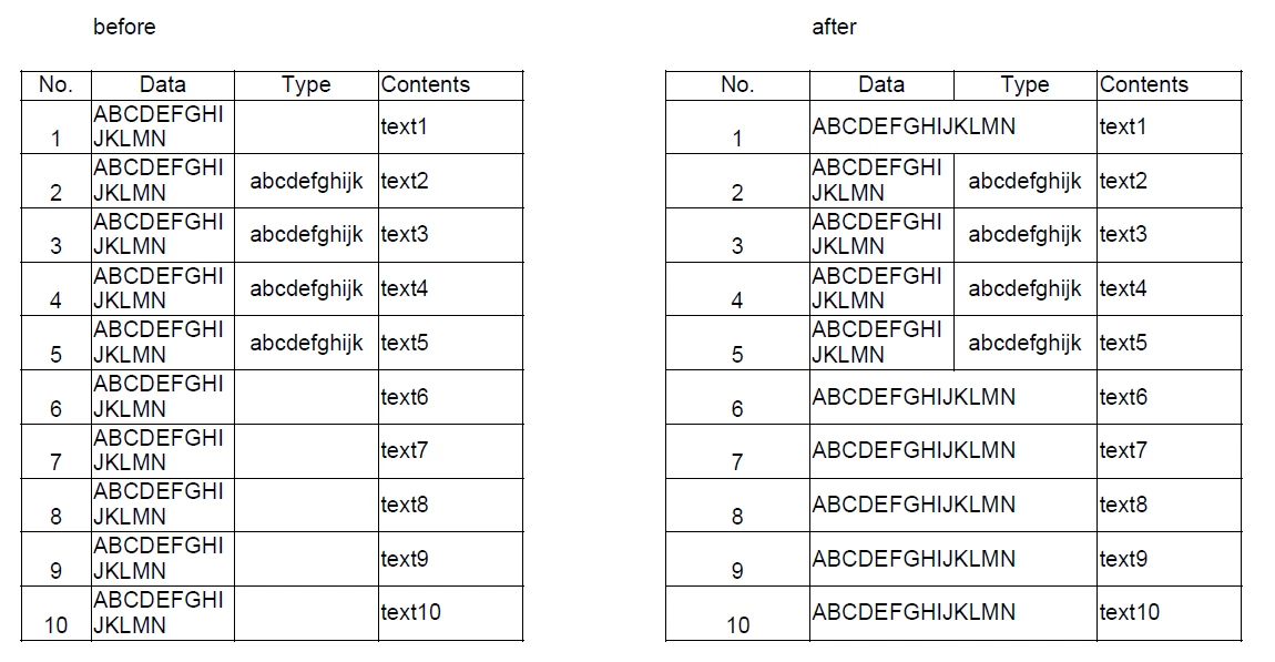 データ列の文字列は、長文なためデータ、タイプのセル結合して文字列の折り返しを少なくしたいです。