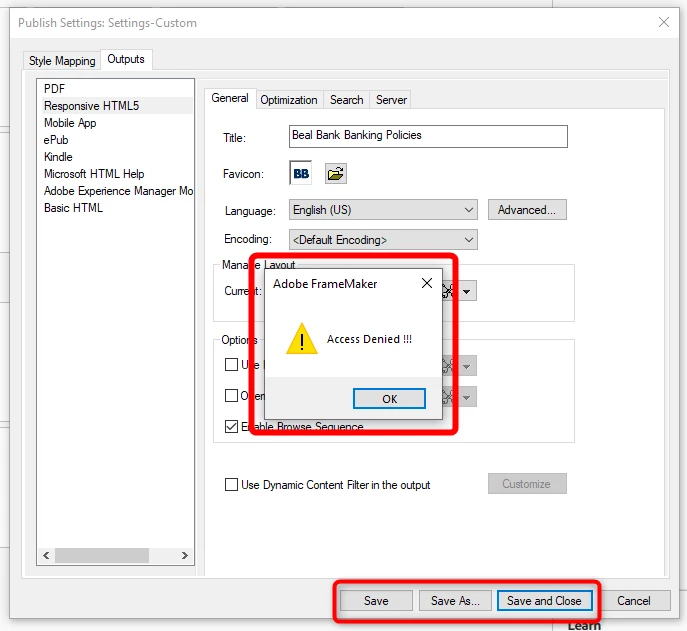 "Access Denied" when trying to edit Responsive HTML5 Publish Settings