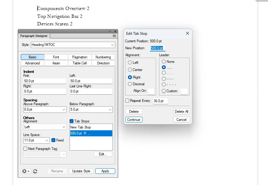 I want to add a leader to my mini TOC so that the page numbers are right-aligned. I've added a tab stop to the relevant Paragraph Style (Heading1MTOC style), but that doens't change the formatting. I've tried deleting and re-creating the mini TOC and changing the tab position, but nothing works. I feel like I'm missing something obvious. Any ideas on how I can add the leader?