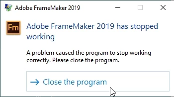 Adobe FrameMaker 2019 has stopped working pop-ups
