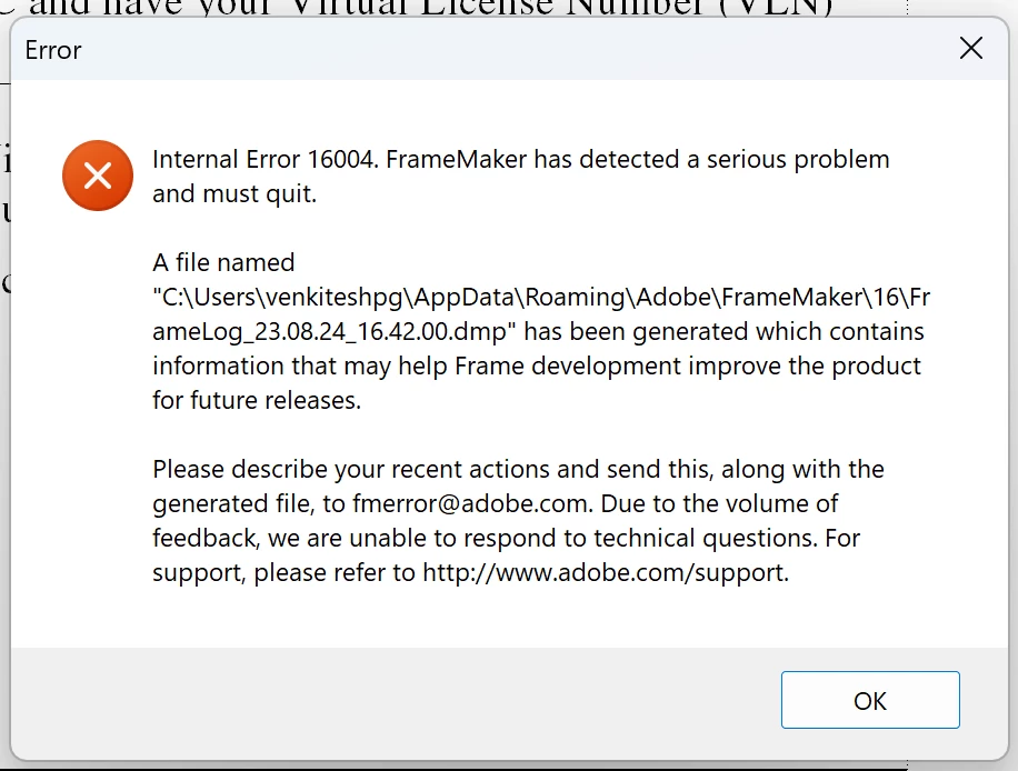 I am using Adobe FrameMaker 2020 (version ) on Parallels VM. The application crashes every time I reach the last page of any document. Earlier, it crashed when I just opened any file. I couldn't fix it, I reinstalled windows and now it can at least open the files, and I can make changes. However, it still crashes upon scrolling to the last page of any FM file. Any solution on how to fix this? This error popup is displayed jus before the application quits - 16004.