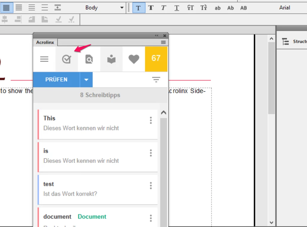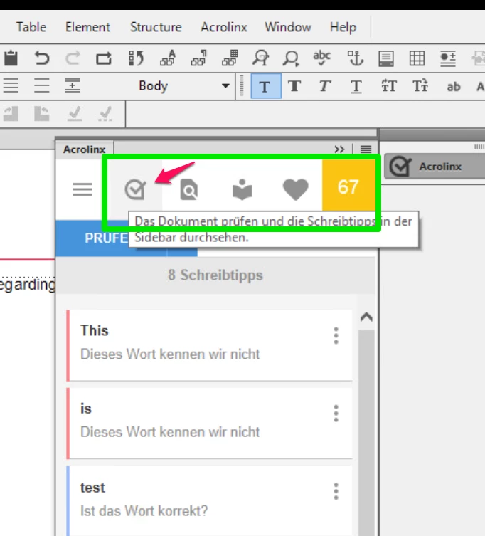 When I perform a check in FrameMaker 2019 (OS: Windows 10 Pro) with the 'Acrolinx' app and then move the mouse over the elements (green rectangle,FM_start_visible.png), corresponding information is displayed (see FM_start_visible.png).