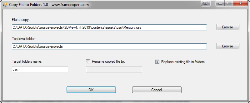 This particular client was editing a single css file and wanted it copied to 17 target folders. Since the edits were done interatively and she wanted to check the results throughout her project, this saved her tons of time whenever she made an edit. Note that the dialog box settings are "sticky" so that it is prepopulated with the last-used settings.