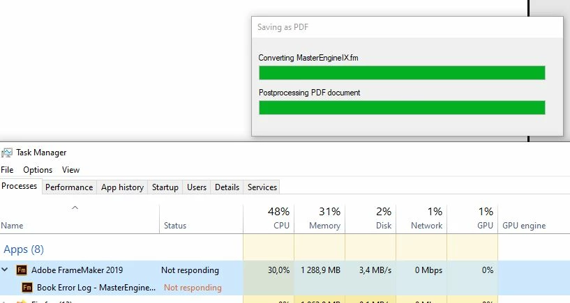 The "Postprocessing PDF document" takes very long time, and at the end either FM crashes, or a "done" message box is shown. (Not the regular one, with view log, show output etc.)