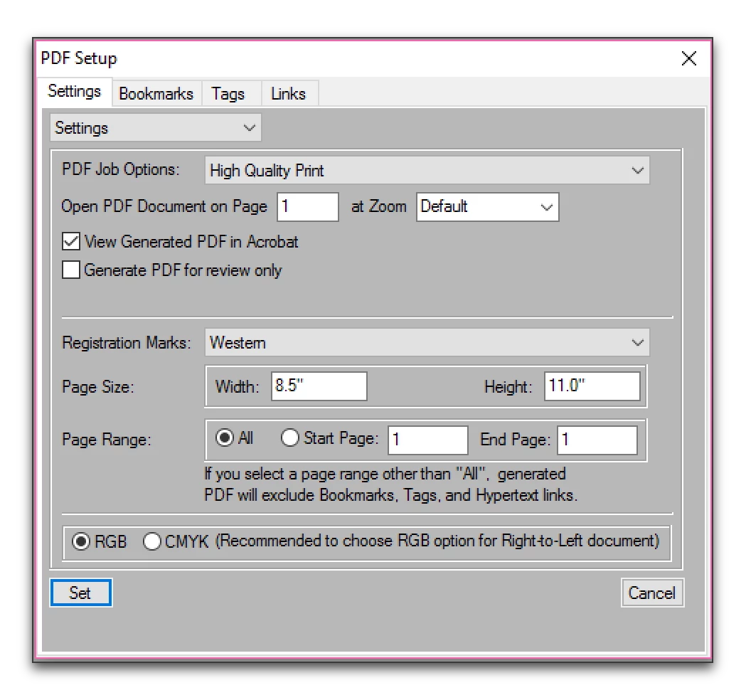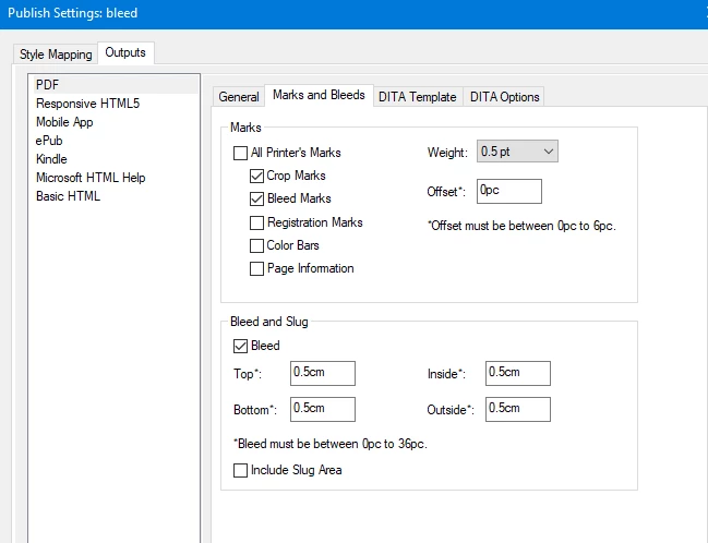 To confirm the bleed, print or create a PDF with the page size set larger than the actual size, and the Registration Marks set to Western.