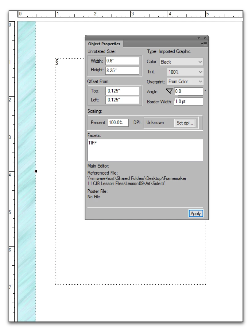 To shift the banner up and left, go to Graphics > Object Properties and change the Top and Left Offsets to -0.125". (Positive values move the image down and right, negative values move it up and left.) Note: you won't ever see the bleed in FrameMaker, but you can see the offset values and the missing handles.