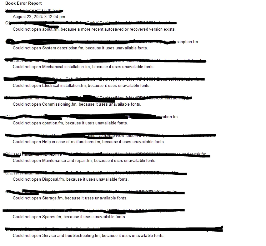 Yes guessed correct .. i try to create a book ... i create a files individual and then in new document creaqte a book and adding those file in book to bind those invidal file in one file. upadting thoise file pages and chapter...before updating oped those file ... it is correctly updated... but every time it shows an error message realated to cross refrence.. can frame maker craete PDF of book ignoring those error mesasges... I am using DIn pro and Ciutadella family fonts those are installed in my system. still it shows an error message... Is those are paid fonts ???
