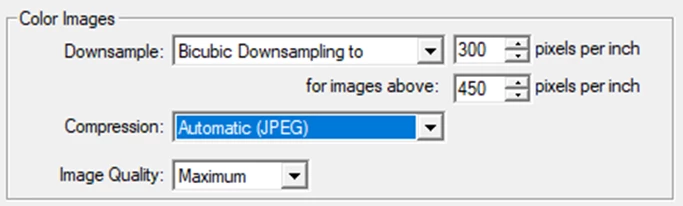 - Create a PDF preset with the image compression settings set to JPEG, Maximum Quality, and to downsample images above 450 PPI to 300 PPI. (These are common defaults).